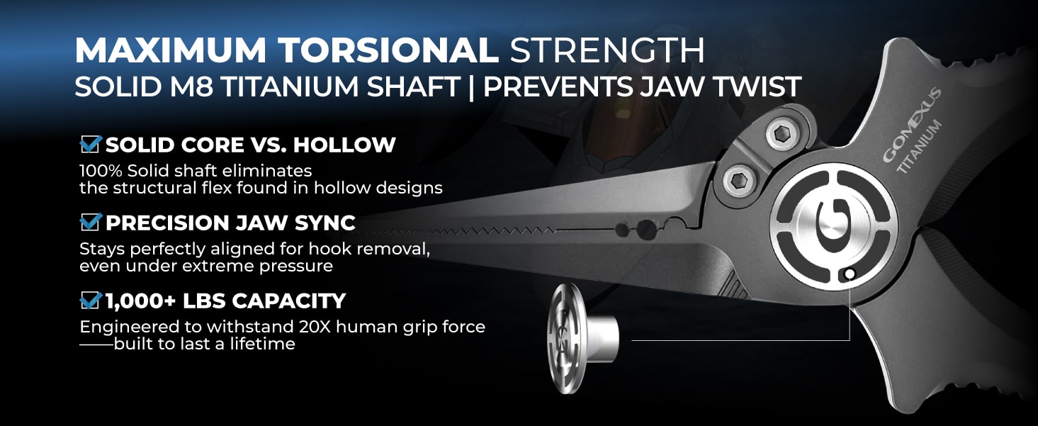 【SOLID M8 SHAFT | UNIBODY CNC STRENGTH】 Experience 2X the torsional strength of standard pliers. Our unibody CNC-machined design features a Solid M8 Titanium Shaft (not hollow), eliminating structural flex and jaw misalignment. With a 1,000+ lbs capacity, these pliers withstand 20X human grip force, ensuring perfect jaw sync and maximum leverage when removing deep-set hooks from big game.