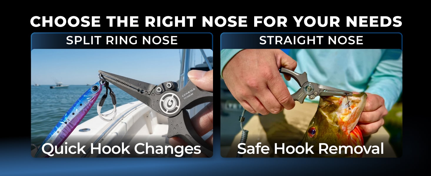 【DUAL VERSATILITY: SPLIT RING & STRAIGHT NOSE】 Choose the perfect tip for your fishing style: The Split Ring Nose is optimized for rapid lure changes and Slow Pitch Jigging, while the Straight Nose provides surgical precision for deep hook removal. Both versions feature serrated jaws for a non-slip grip, knot cinching, and crimping, making them the most versatile multi-tool in your tackle box.