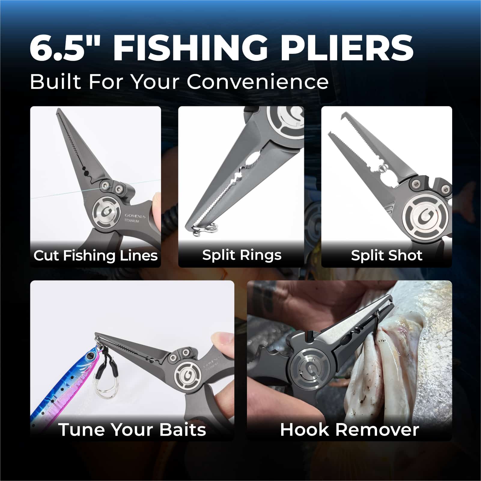 Gomexus 6.5" Full Titanium Fishing Pliers - 100% Saltwater Rustproof | Split Ring & Straight Nose Versions | Tungsten Carbide Cutters & Leather Sheath Gomexus 6.5" Full Titanium Fishing Pliers - 100% Saltwater Rustproof | Split Ring & Straight Nose Versions | Tungsten Carbide Cutters & Leather Sheath